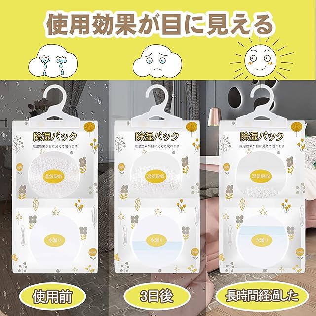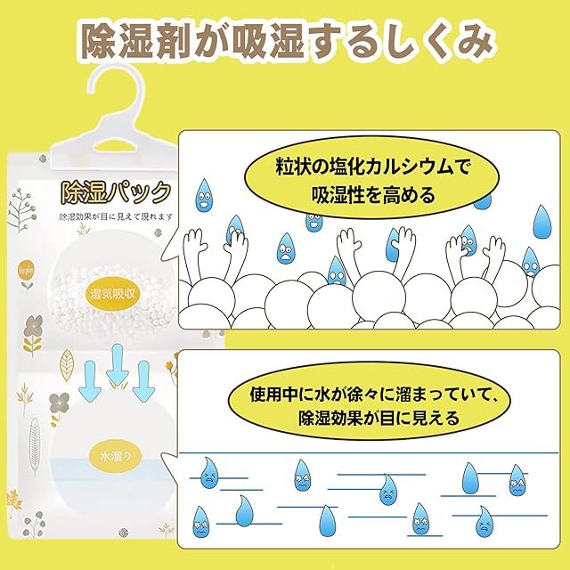 製品仕様 成分:塩化カルシウム 本品は吊り下げタイプの除湿剤 クローゼットの中に吊り下げるだけで簡単に除湿できます。除湿しながら気になるニオイを脱臭します。また、非常にコンパクトなサイズなので、この除湿剤 部屋やキャンプカー、船など様々な場所に適用します。電気使わずに簡単除湿でき、より省エネ・エコな暮らしを楽しめます。この乾燥剤 部屋用には最適です。