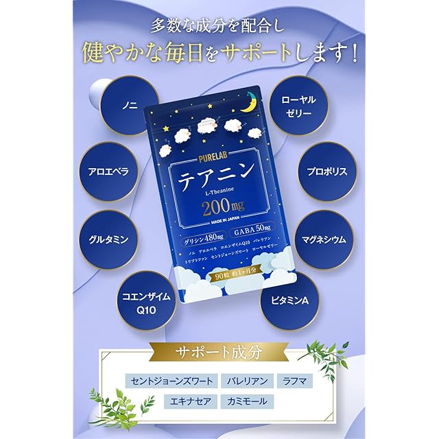 商品名:PURELAB テアニン1日200㎎ グリシン1日480㎎ GABA1日50㎎ アロエベラ 30日分 エキナセア バレリアン サプリメント 国内製造