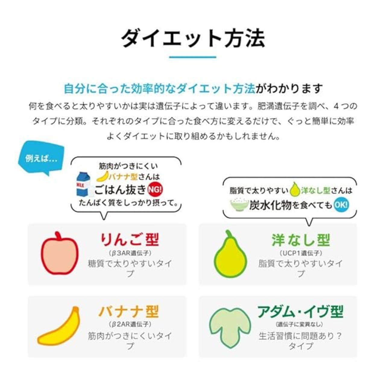 本キットには、別の遺伝子検査キット(DIET・SKIN・SPORTS)の検査結果(別売で各5,980円、合計17,940円分)が含まれます。(DNAの品質等により、一部の検査結果が得られない場合があります)