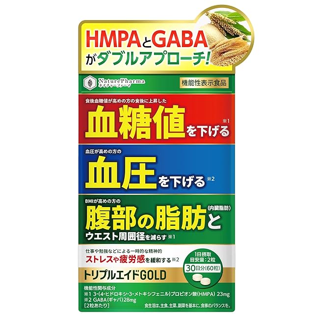 商品名:トリプルエイドGOLD 血糖値を下げる 血圧を下げる 内臓脂肪を減らす ストレス緩和 疲労感緩和 【機能性表示食品】 GABA サプリHMPA 30日分
