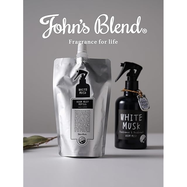 ●シンプルで柄に頼らないデザインと厳選された心地良い香りが特長の「John's Blend シリーズ」<br>●植物性の消臭成分を配合したスプレータイプのルームフレグランス<br>●手持ちのボトルがそのまま使えるお買い得な詰め替え用<br>●サボン系の爽やかさとホワイトフローラルのほのかな甘みがクセになるホワイトムスク。どこか懐かしさも感じられる優しい香調は、男女問わずお使いいただけます