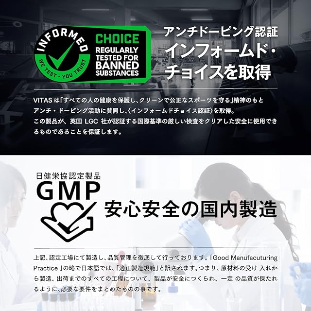 【インフォームドチョイス取得】英国LGC社が運営するアンチ・ドーピング認証プログラム。WADA(世界アンチ・ドーピング機関)によって使用が禁止されている物質が製品中に混入していないかを、高度の分析技術と製造工程の監査によって、分析・検査・試験を行うアンチ・ドーピング認証プログラムです。