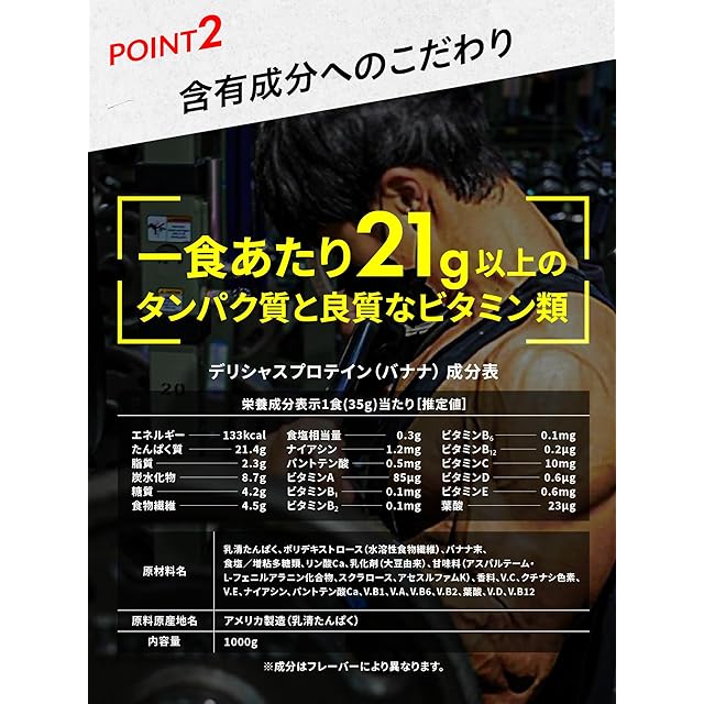 【含有成分へのこだわり】1食当たり21.4gのタンパク質と含有率が十分に高く、良質なビタミンも複数配合。それでいて味が良くて溶けやすく、さらに経済的な心配なしに飲めるプロテインです