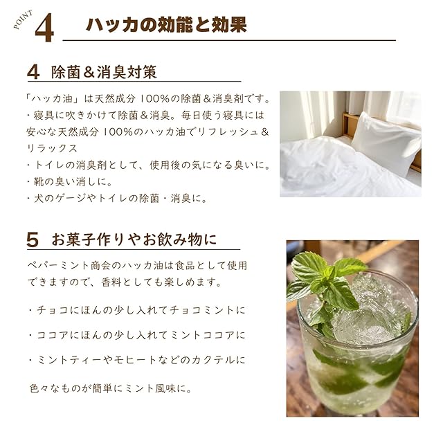 ペパーミント商会のハッカ油は添加物製造業の許可を受けて製造している食品添加物なので、食品やお飲み物はもちろん、マスクにも安心してご使用できます。※雑貨として販売しているハッカ油にご注意ください。 大容量100mlの天然ハッカ油スプレーです。詰め替えの面倒な手間がかからず大変便利でコスパも最高です。