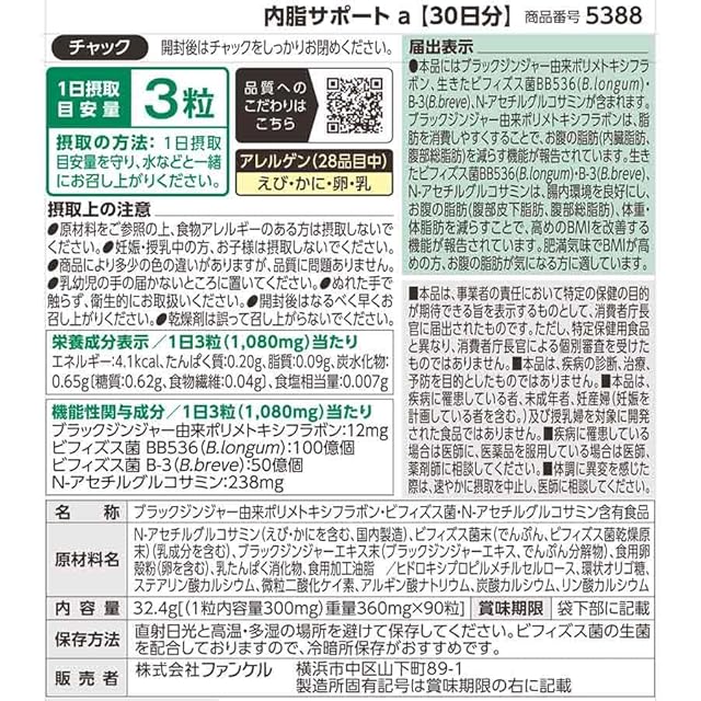 【体重・体脂肪、おなかの脂肪を減らす!】<br>腸内環境を良好にし、体重・体脂肪を減らす2種のビフィズス菌とN-アセチルグルコサミンを配合。<br>脂肪を消費しやすくするブラックジンジャー(ポリメトキシフラボン)をさらに配合することで、おなかの脂肪(内臓脂肪・腹部総脂肪)を減らします。 <br>独自技術「バリア&リリース製法」で、成分を守って届けることにもこだわりました。<br><br>【こんな方におすすめ】<br>肥満気味でBMIが高めの方、お腹の脂肪が気になる方、生活習慣をなかなか変えられないが対策をしたいと思っている方に。<br><br>【届出表示】<br>本品にはブラックジンジャー由来ポリメトキシフラボン、生きたビフィズス菌 BB536(B.longum)・B-3(B.breve)、N-アセチルグルコサミンが含まれます。<br>ブラックジンジャー由来ポリメトキシフラボンは、脂肪を消費しやすくすることで、お腹の脂肪(内臓脂肪、腹部総脂肪)を減らす機能が報告されています。<br>生きたビフィズス菌BB536(B.longum)・B-3(B.breve)、N-アセチルグルコサミンは、腸内環境を良好にし、お腹の脂肪(腹部皮下脂肪、腹部総脂肪)、体重・体脂肪を減らすことで、高めのBMIを改善する機能が報告されています。<br><br>肥満気味でBMIが高めの方、お腹の脂肪が気になる方に適しています。<br><br> 【1日の目安】<br> 3粒 / 30日分<br><br>【機能性関与成分/1日3粒当たり】<br> ブラックジンジャー由来ポリメトキシフラボン:12mg、ビフィズス菌BB536(B.longum):100億個、ビフィズス菌B-3(B.breve):50億個、N-アセチルグルコサミン:238mg <br><br>【機能性表示食品についてのご注意】 <br>※本品は、特定保健用食品と異なり、消費者庁長官による個別審査を受けたものではありません。 <br>※疾病の診断、治療、予防を目的としたものではありません。<br>※食生活は、主食、主菜、副菜を基本に、食事のバランスを。<br><br> 【アレルゲン(28品目中)】 <br>えび・かに・卵・乳 <br><br>【ご注意】<br> ※妊娠・授乳中の方、お子様はお召し上がりにならないでください。<br>※ブラックジンジャー配合により、カプセルの色がグレーになっています。