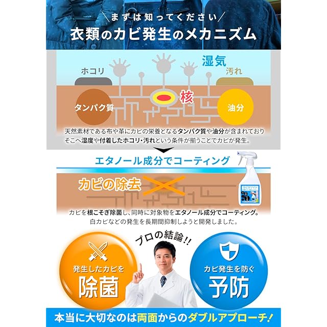 【本製品について】革製品、布製品や衣類などに使用できるカビ取り剤です。アルコールタイプのため革や生地を傷めず、カビのエサとなる菌を除菌できるため、防カビ消臭が長期間持続します。