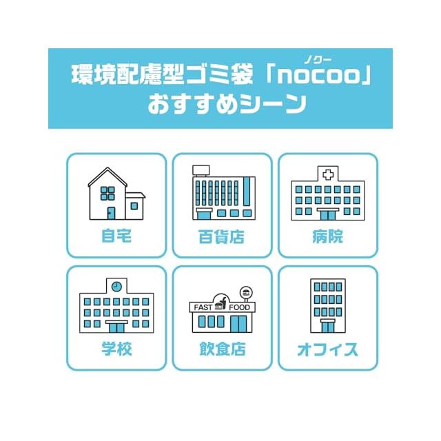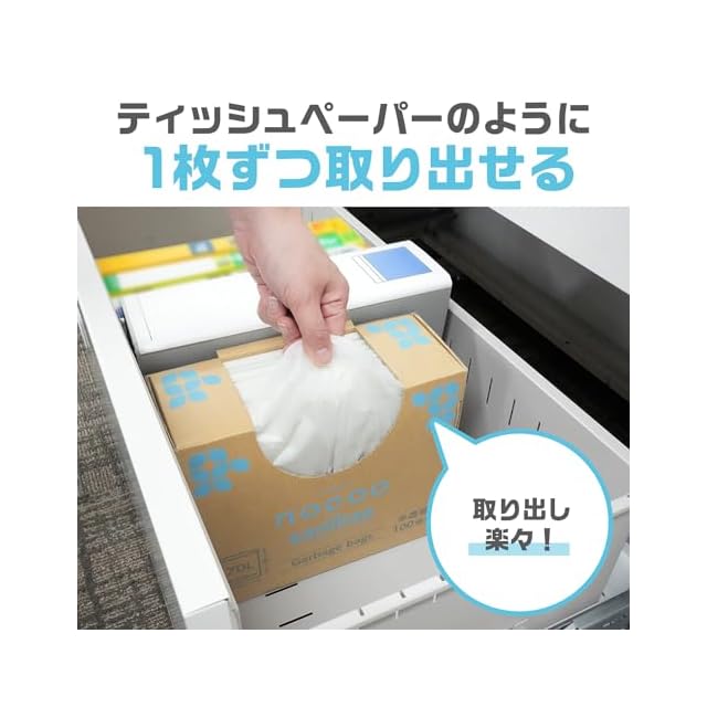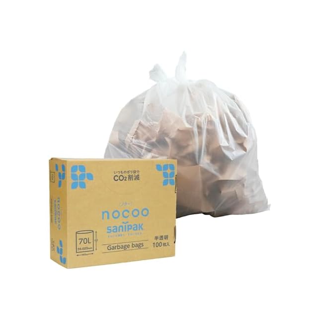 【丈夫&環境にやさしい】<br>製造時のプラスチック使用量&燃焼時のCO2をポリエチレン100%のゴミ袋と比べ約20%削減したごみ袋です。<br>環境に配慮しつつ、使いやすさにもこだわりました。<br>また、半透明色なので中身が見えにくくプライバシーも守られます。<br><br>【CO2削減に貢献するゴミ袋】<br>天然ライムストーンにストレッチフィルムなどを再生原料化し加えたマスターバッチ(ペレット状の原料)を、<br>EUの企業であるGCRグループが製造し当社へ供給、これを当社自社工場独自の技術によりゴミ袋へ配合実現。<br>ライフサイクルでのCO2削減を可能にしました。<br><br>【収納しやすい】<br>収納場所を取りたくないというニーズにお応えし、BOX型にしました。<br>1枚ずつ取り出しやすく、コンパクトに収納できるBOX型パッケージは、<br>キッチン引き出しやオフィス・収納棚等へ収納しやすく場所取らず便利です。<br><br>【サニパックの想い】<br>サニパックはSDGsに関して考え、製品開発を行っています。<br>nocooは環境問題へ本気で取り組む、サニパックの大きな一歩となります。 <br>世界と手を取り合って、環境品質の高い製品作りと、今より高い環境意識の共創できるようにしていきます。<br><br>【商品詳細】<br>容量:70L <br>袋のサイズ:横幅80cm×高さ90cm <br>厚さ:0.025mm <br>枚数:100枚 <br>色:半透明 <br>材質:ポリエチレン(高密度ポリエチレン)<br>原産国:インドネシア<br>