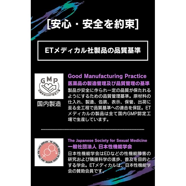 【安心の国内GMP認定工場製】 ETメディカル社製の商品は厳しい基準をクリアしたGMP認定を受けた国内工場で製造。GMPとは商品が安全に作られ一定の品質が保たれるようにするための品質管理基準。原材料の仕入れ〜製造、出荷に至る全ての工程で品質基準への適合を。