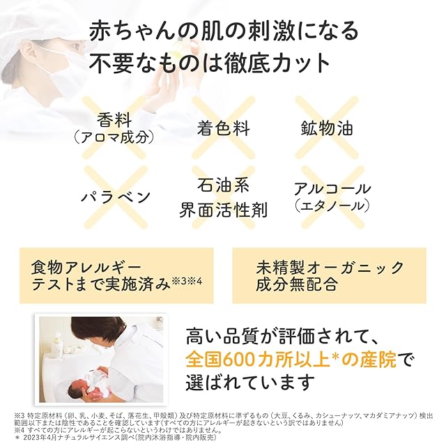 【受賞歴】・たまひよ 赤ちゃんグッズ大賞2023※ スキンケア部門 クリーム 第1位 ※たまひよ赤ちゃんグッズ大賞とは、たまごクラブ・ひよこクラブ2023年3月号に掲載のランキング結果です。【調査方法】Web調査【対象者】全国の生後0ヶ月~1歳6ヶ月のお子さまを持つ、たまひよ読者約2000人 ・人気育児ブランド※1ベビースキンケア部門No.1 ※1 2022年7月ゼクシィBaby調べ ・ベビーカレンダーアワード2022ベビー用保湿剤部門大賞 ・ペアレンティングアワード2022※2モノ・サービス部門大賞 ※2ペアレンティングアワードは、育児雑誌メディアが中心となり、子育てにまつわるトレンド(ヒト・モノ・コト)を表彰し、信頼性が高くタイムリーな情報を提供するアワードです。