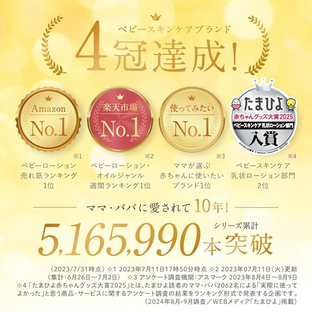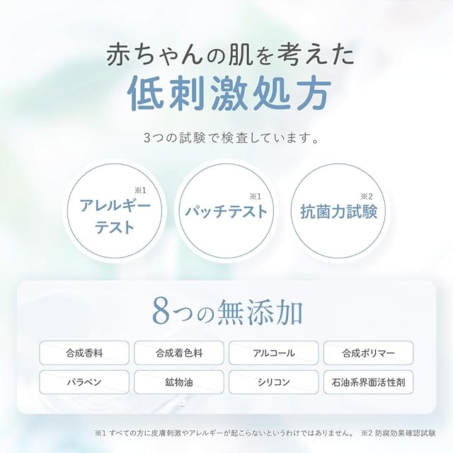【 こんな方におすすめ 】乾燥や肌荒れが気になるが薬以外でケアしてあげたい。赤ちゃんのスキンケアは無添加で安心できるものを使いたい。別の保湿剤を使っているが保湿力が物足りない。ベタつくのが苦手で塗りやすいものがいい。★ベビーオイルやベビークリームとの違いは? ★ベビーローションは肌の乾燥を防ぎ、うるおいを与えます。ベビーオイルはマッサージ用や部分ケア、ベビークリームはより高い保湿力を求めている方におすすめです。入浴の後や朝など毎日の保湿ケアにローションをお使いください。乾燥する時期や乾燥が気になる部分には、さらにベビーオイルやクリームを重ね付けすると効果的です。併用をおすすめしております。